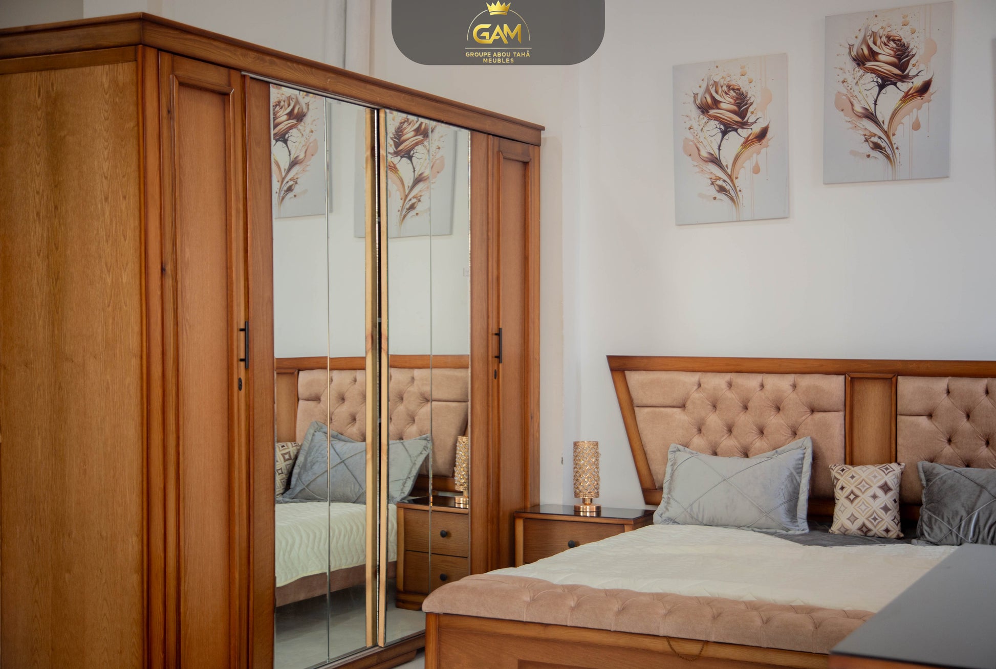 🌹 تتكون من 5 قطع: سرير مزدوج، طاولتان جانبيتان (طوابل دونوي)، كوافاز أنيقة، وخزانة فخمة من الخشب الأحمر الفاخر.