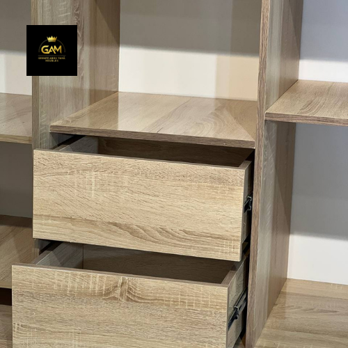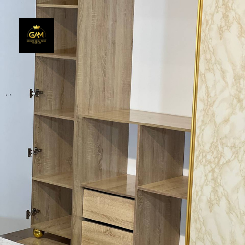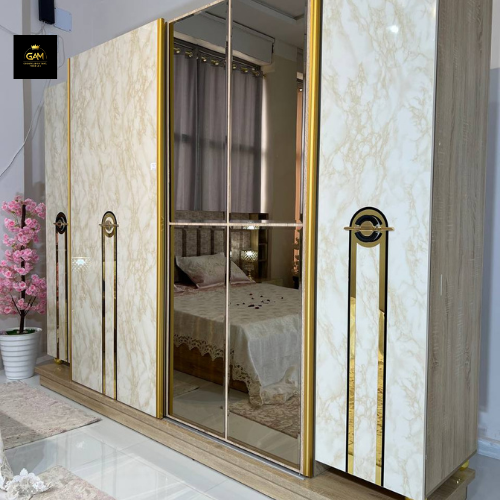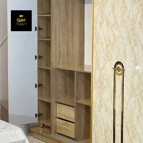 ✔ خزانة كبيرة بأبواب جرّارة أو مفصلية، مع تقسيم داخلي ذكي يشمل أرفف، أعمدة تعليق، وأدراج متعددة 🧥👚