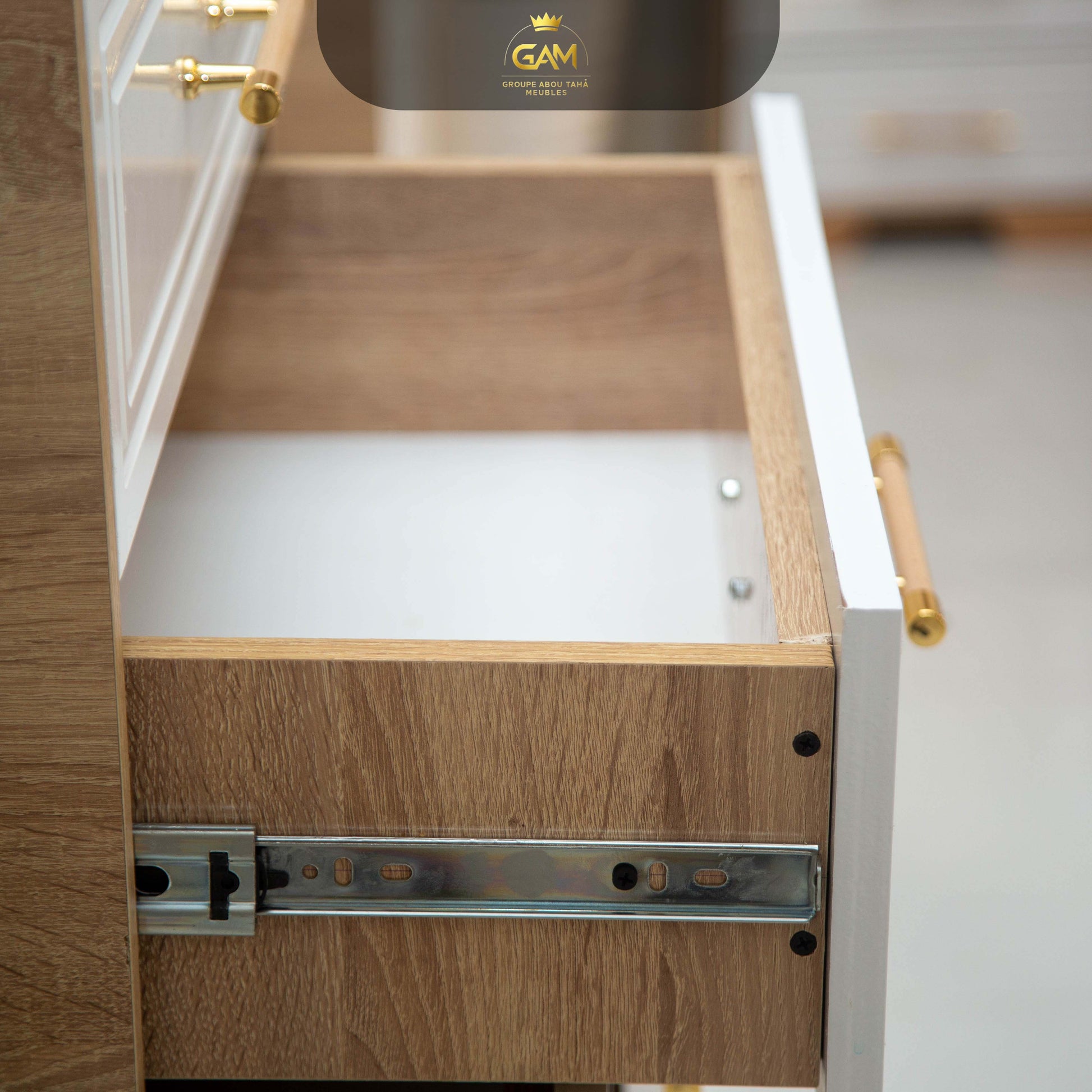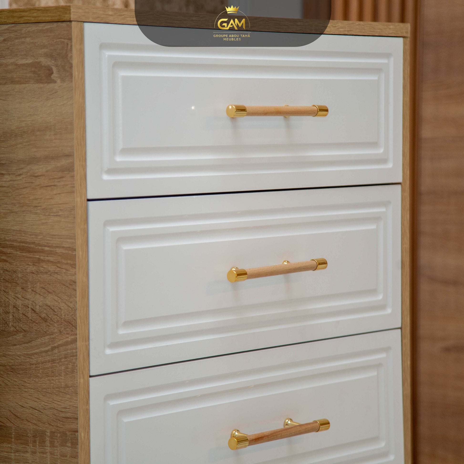 الهيكل: تصميم أبيض راقٍ بخمس أدراج واسعة وسهلة الانزلاق.