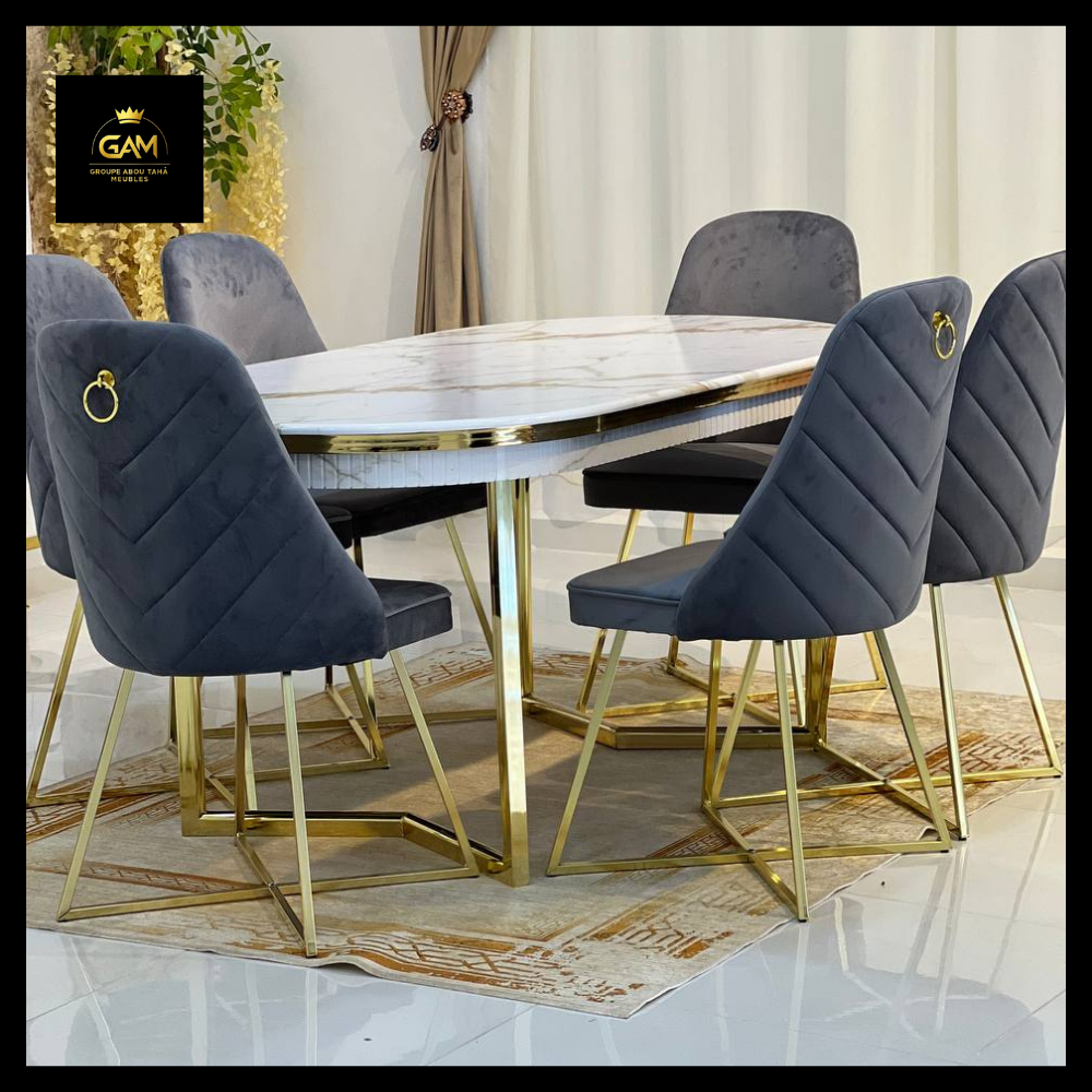 طاولة طعام راقية تتسع لستة أشخاص، بتصميم عصري يضفي لمسة جمالية على غرفة الطعام. مثالية للعائلات ولمحبي الأناقة والبساطة في نفس الوقت.