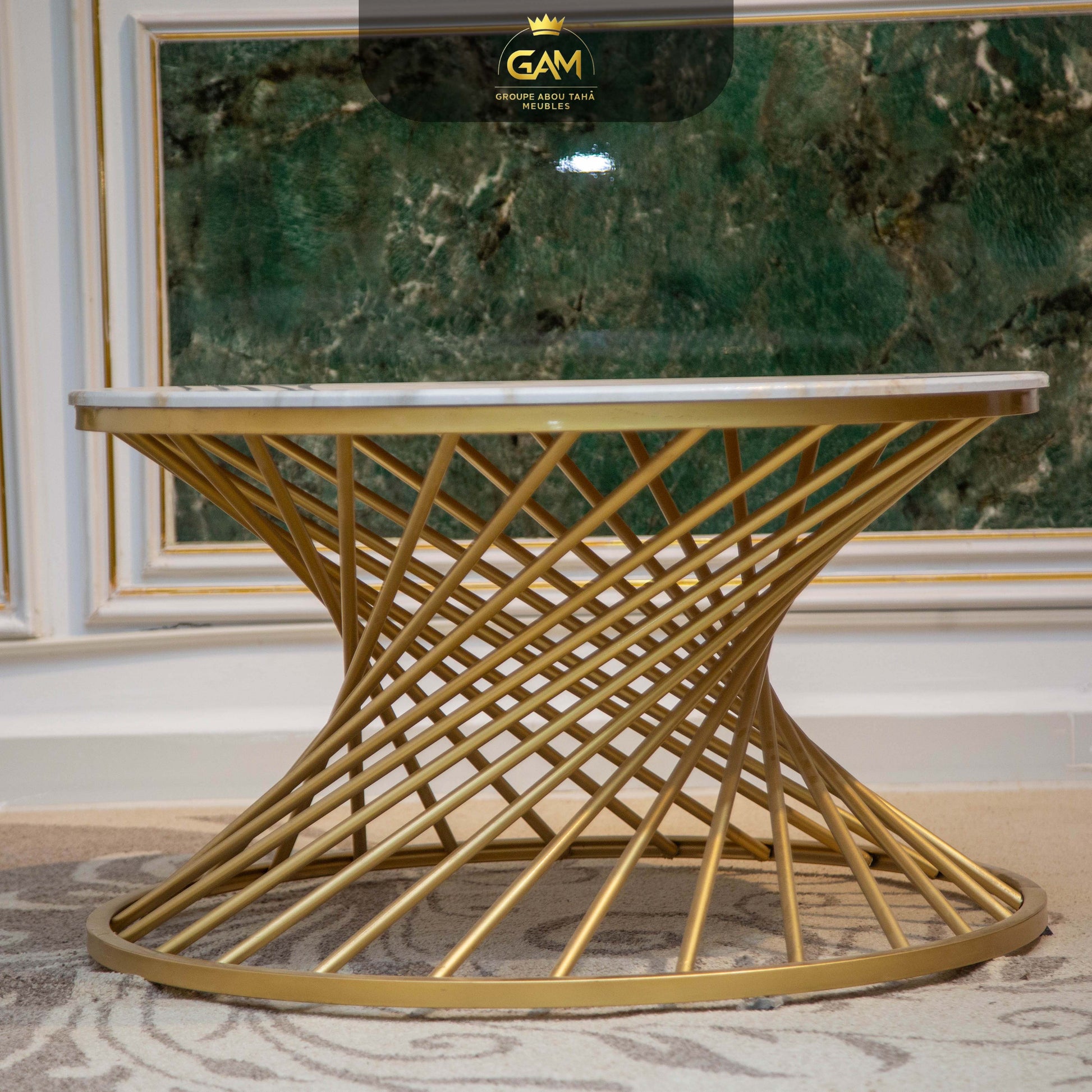 🟡 قاعدة ذهبية متشابكة على شكل رياشة تمنح الطاولة طابعًا فنيًا مميزًا.