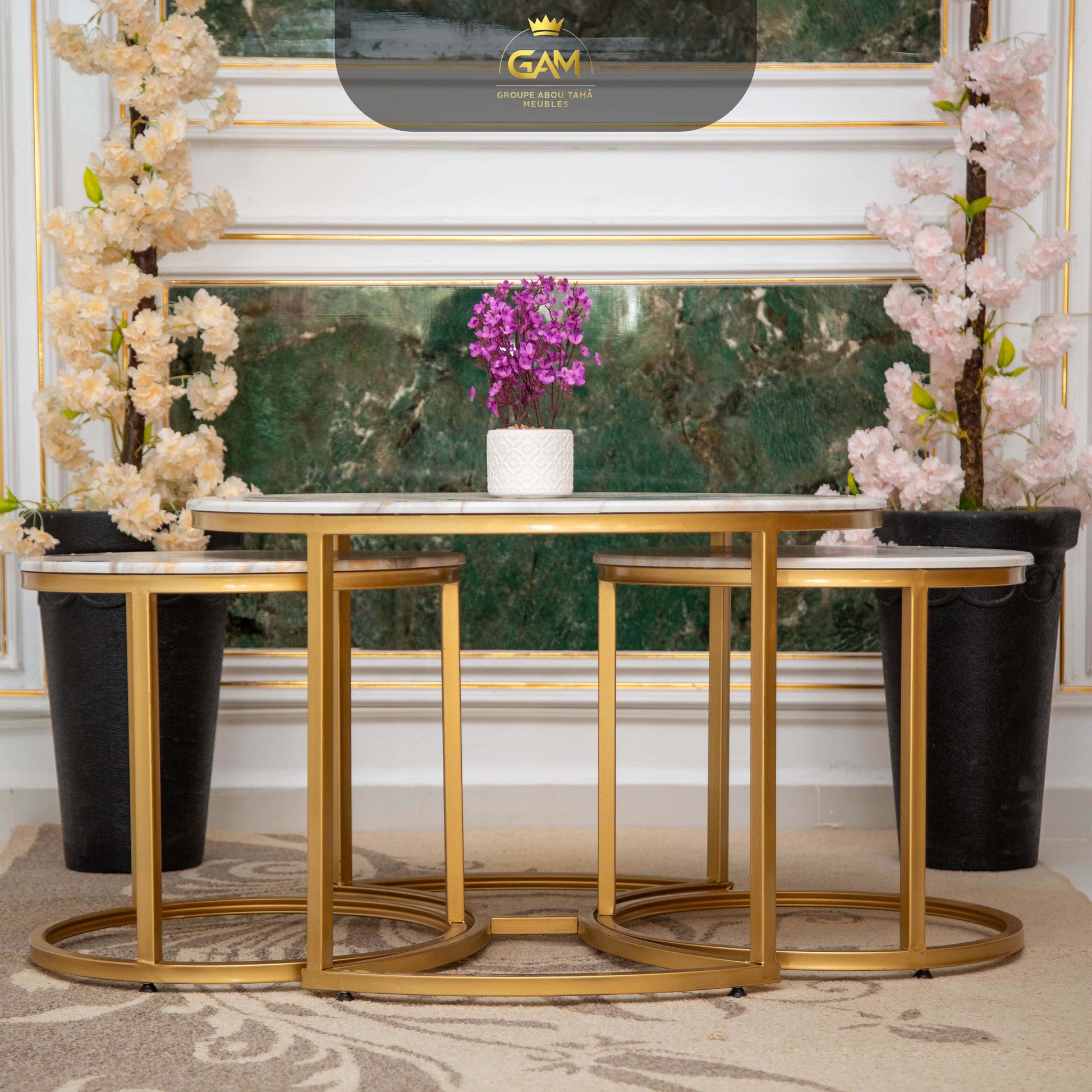 تتميّز الطاولات بهيكل من المعدن الذهبي اللامع يمنحها مظهرًا راقيًا وثباتًا مثاليًا، مع سطح من بديل الرخام (MDF بنقشة رخام فاخرة) يضفي طابعًا فاخرًا يعكس الذوق العصري الحديث.