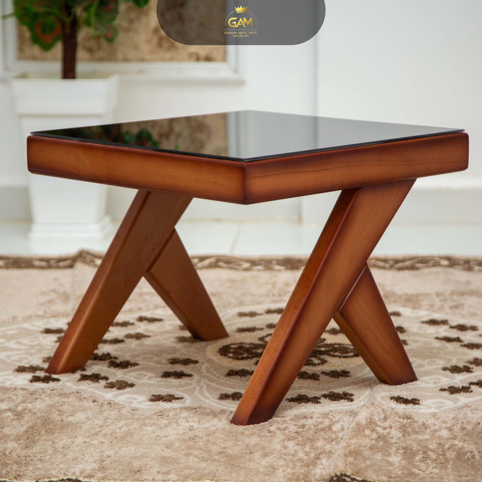 🟡 قاعدة خشبية بتصميم هندسي على شكل Y تضيف لمسة فنية فريدة.